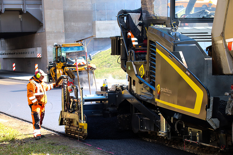 Zum Einsatz kam dabei leistungsstarke Maschinentechnik, darunter unter anderem zwei Straßenfertiger sowie mehrere Walzenzüge, die eine präzise und effiziente Umsetzung gewährleisteten.
